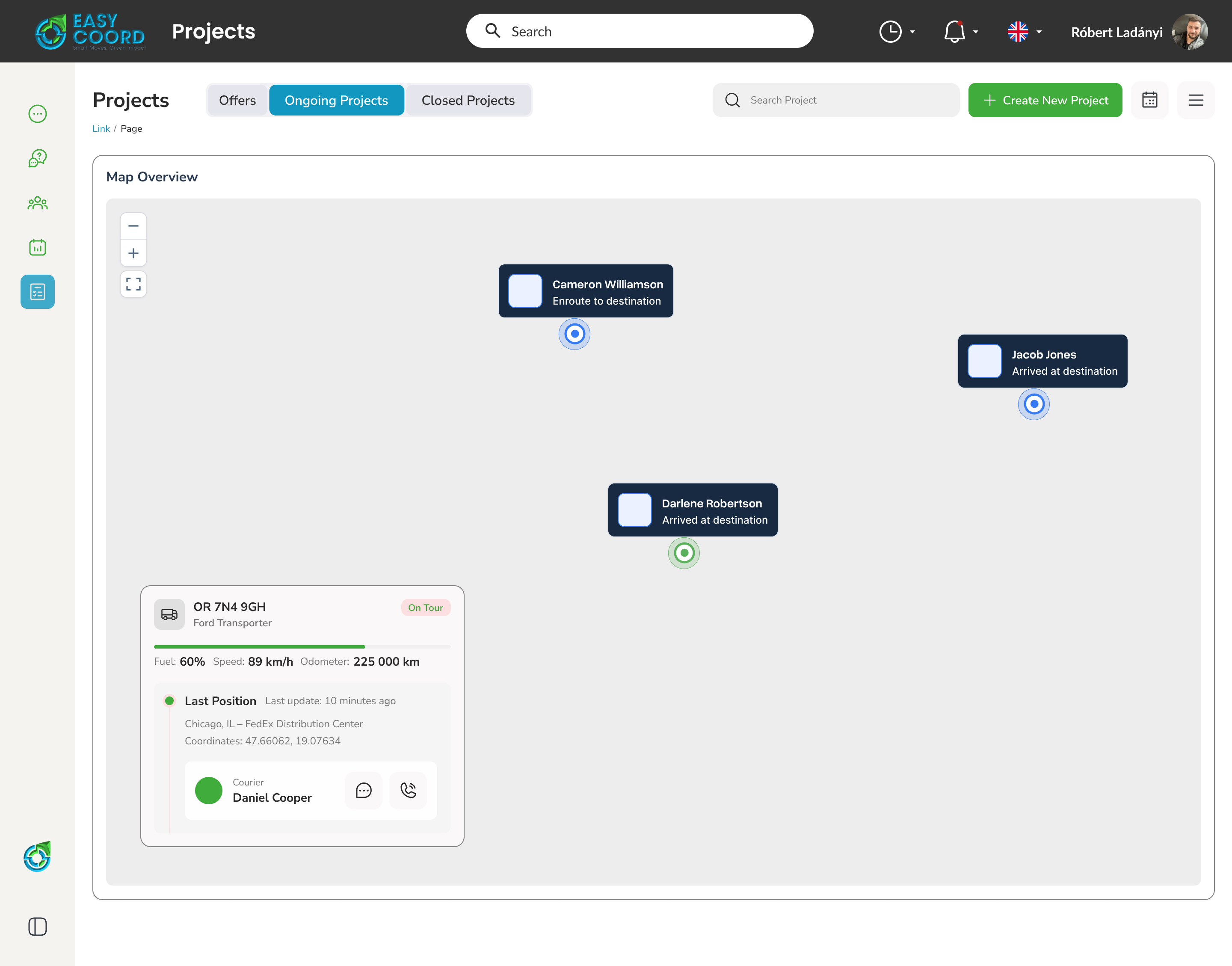A térképes nézetnek köszönhetően valós időben követheted a járművek mozgását, az aktuális státuszokat, a megtett távolságot és az időadatokat. A rendszer folyamatos visszajelzést ad arról, hol tart a fuvar, mikor történt meg a rakodás, és mikor érkezik meg a szállítmány.